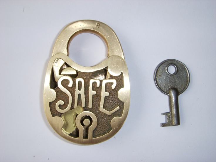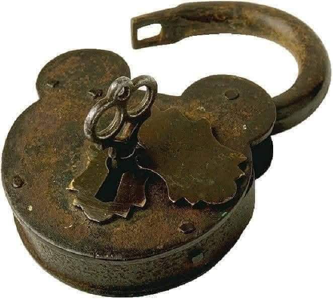 Antique gold finished iron lock and key set for secure wooden gates or antique furniture with intricate handmade work
