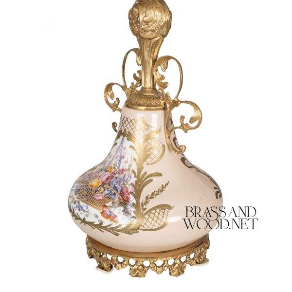 Antique porcelain and brass table lamp with hand painted floral design ornate golden details and elegant fabric shade