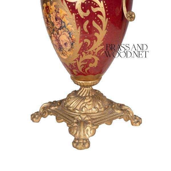 Antique porcelain and brass table lamp with red floral base ornate golden handles elegant fabric shade and classic