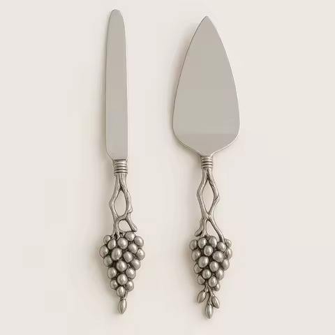 Antique style metal cake knife and server set with grapevine sculpted handles vintage dessert tools for weddings vineyard party