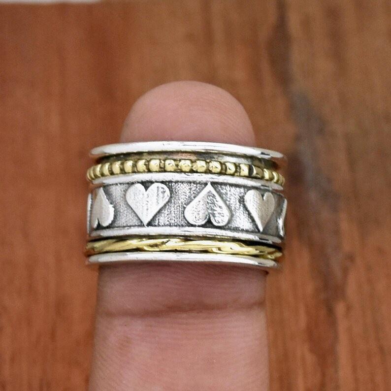 Anxiety Spinner Ring 925 Sterling Silver Wide Band Two Tone Heart Stamped Meditation Ring for Women
