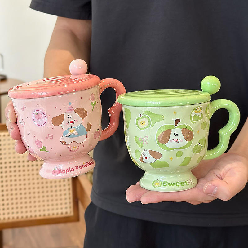 Apple Paradise Ceramic Mug With Lid And Spoon Cartoon Dog Design For Coffee Milk Breakfast Use