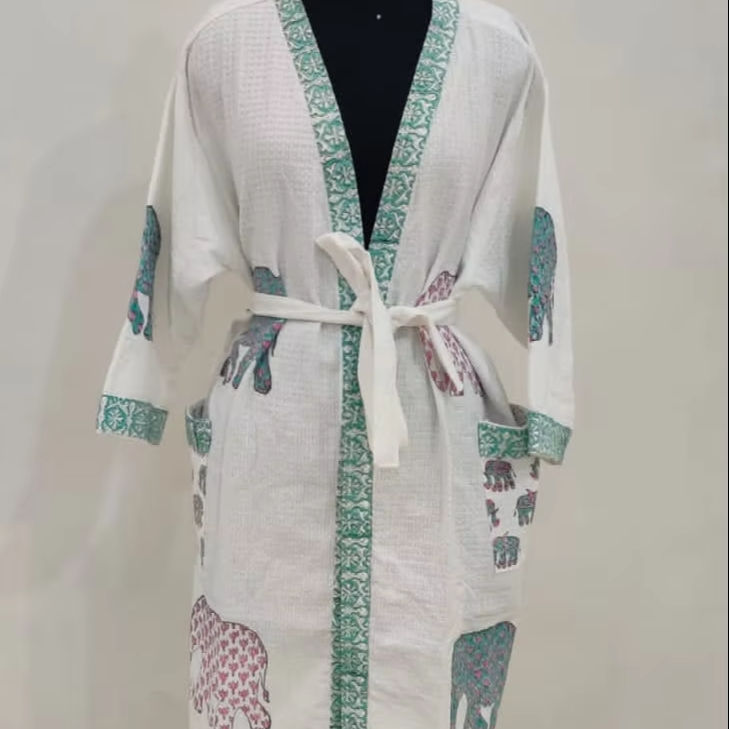 Aqua Blue Premium Cotton Waffle Bathrobe Free Size Hand Block Printed Embroidered White Bath Robe for Spring Parties