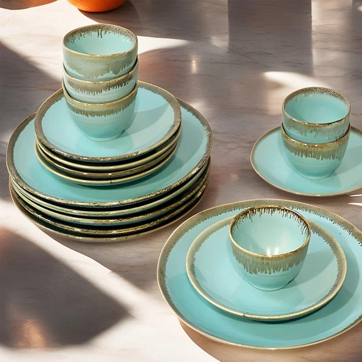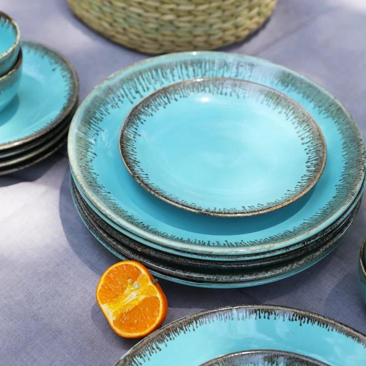 Aqua Coastal Ceramic Dinner Plate Set Rustic Edge Detailing Gloss Glaze Finish Durable Build for Vibrant Dining Experiences