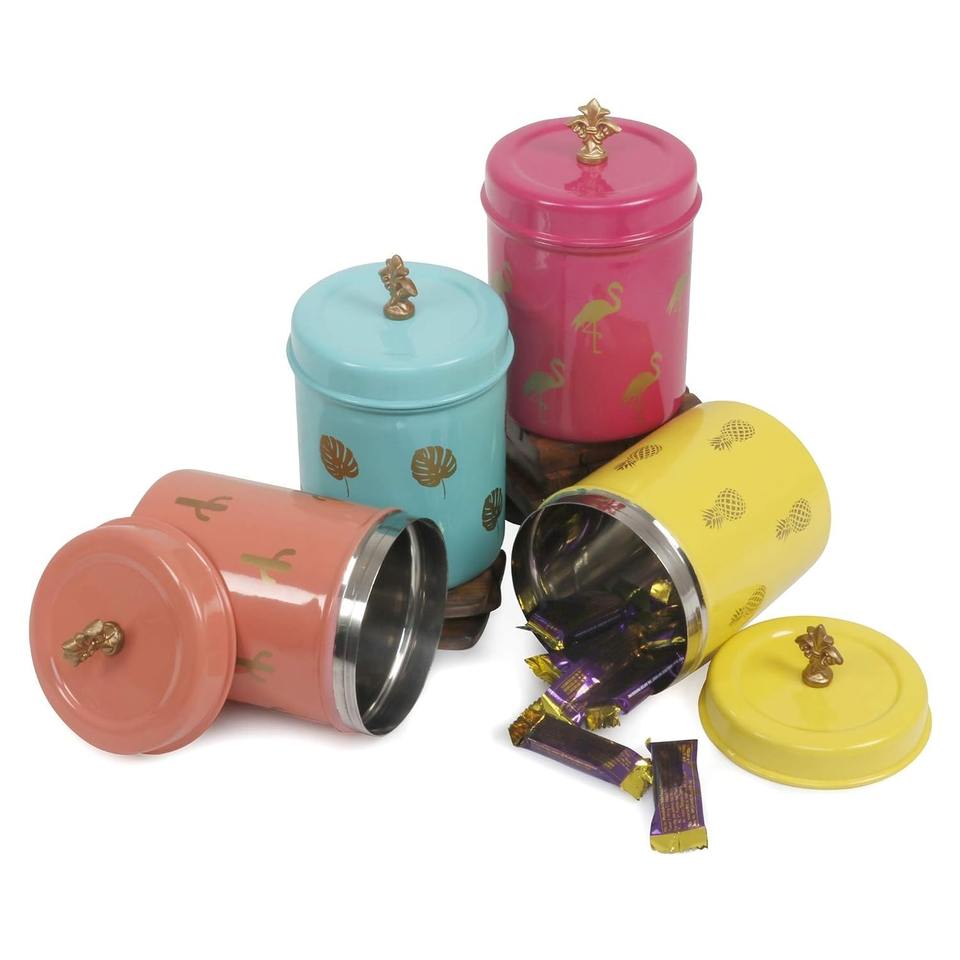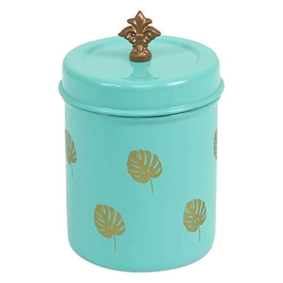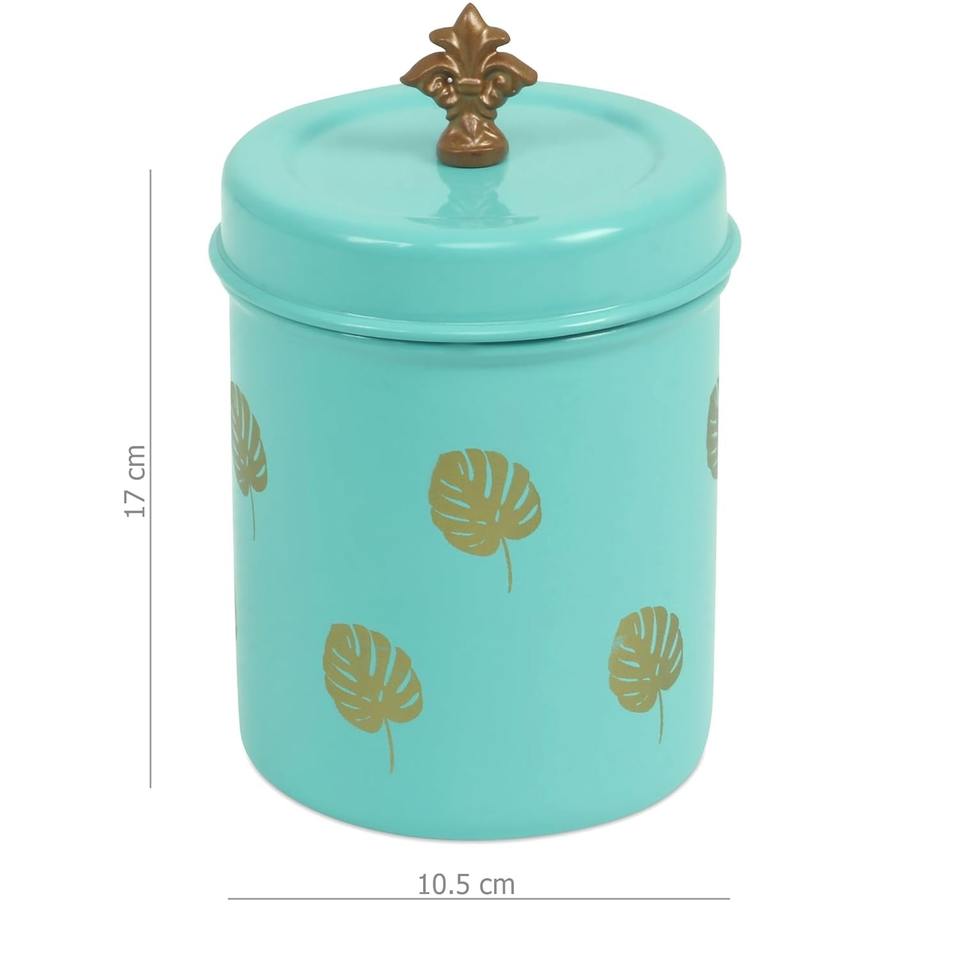 Aqua Monstera Leaf Print Storage Jar Modern Tropical Cylindrical Container with Decorative Knob