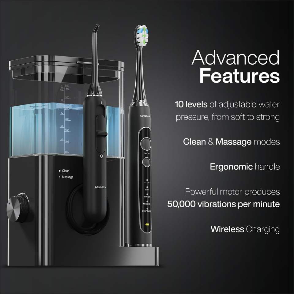 AquaSonic Home Dental Center PRO 600ml Tank, Electric Power Toothbrush & Water Flosser, Black Series Pro+Oral Irrigator