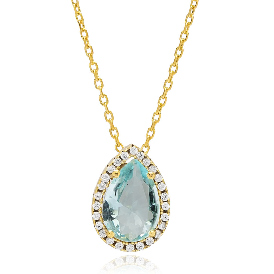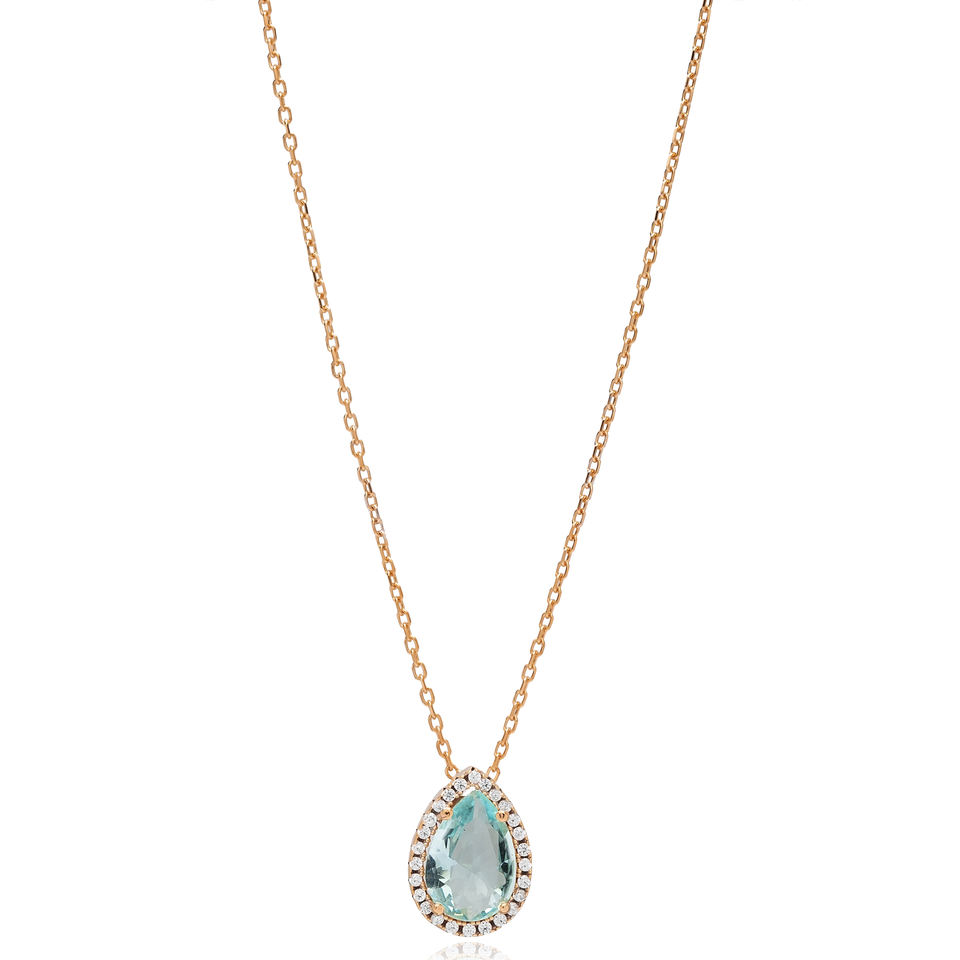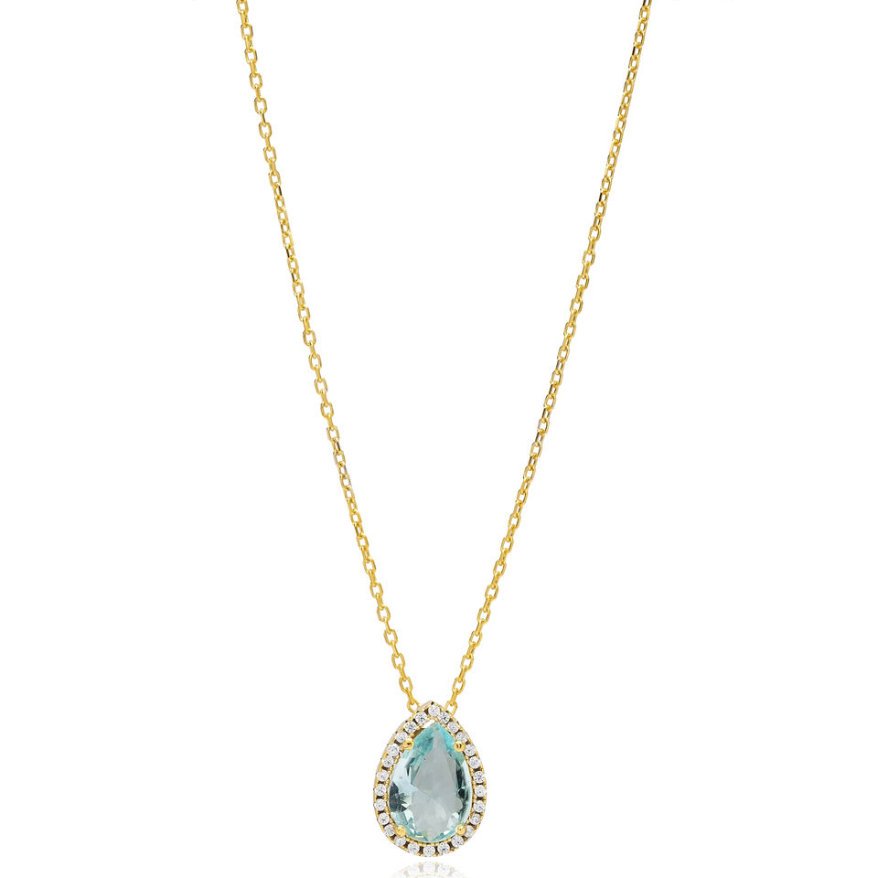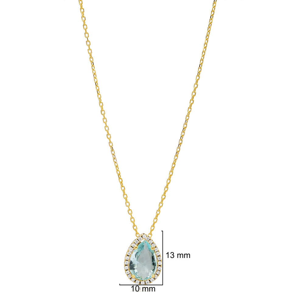 Trendy Aquamarine CZ Stone Pear Drop Shape Design Charm Necklace Engagement Wedding Party Turkish Sterling Silver Jewelry