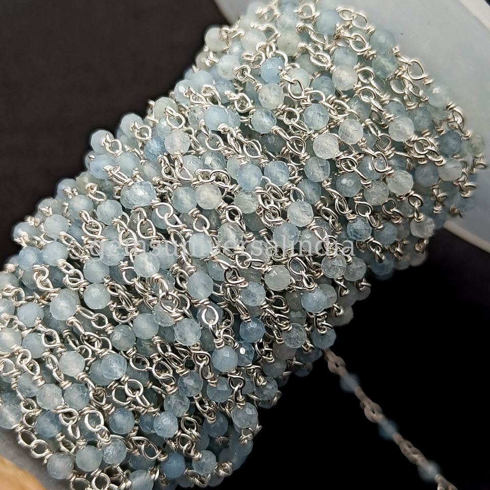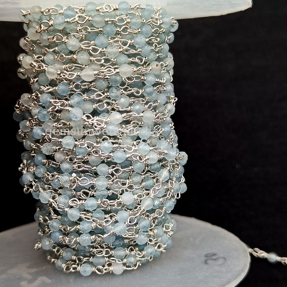 Aquamarine Faceted Rondelles Rosary Chain 925 Sterling Silver Wire Wrapped Chain Roll by the Foot Aquamarine Silver Rosary Chain