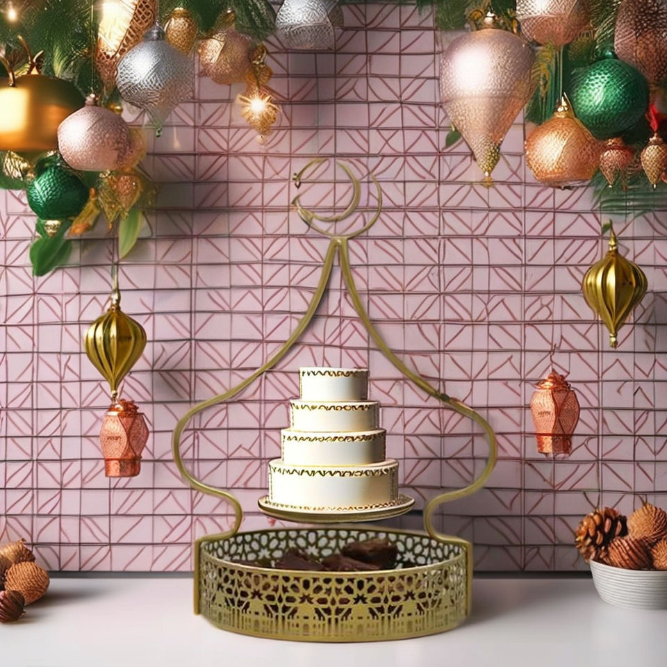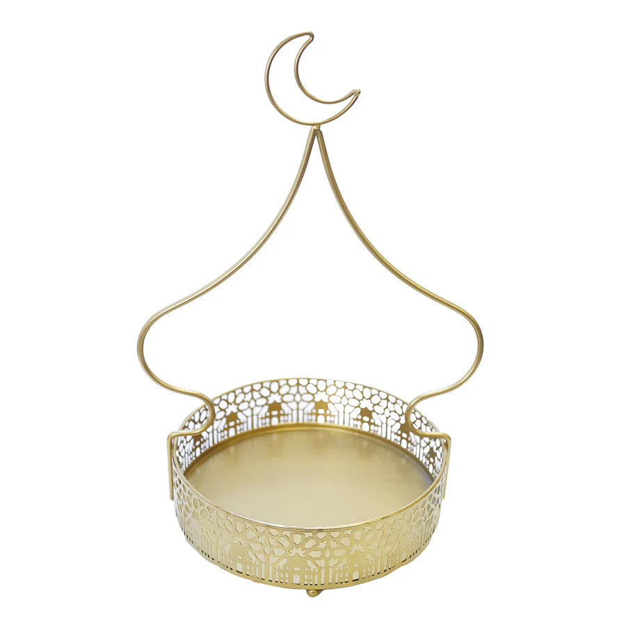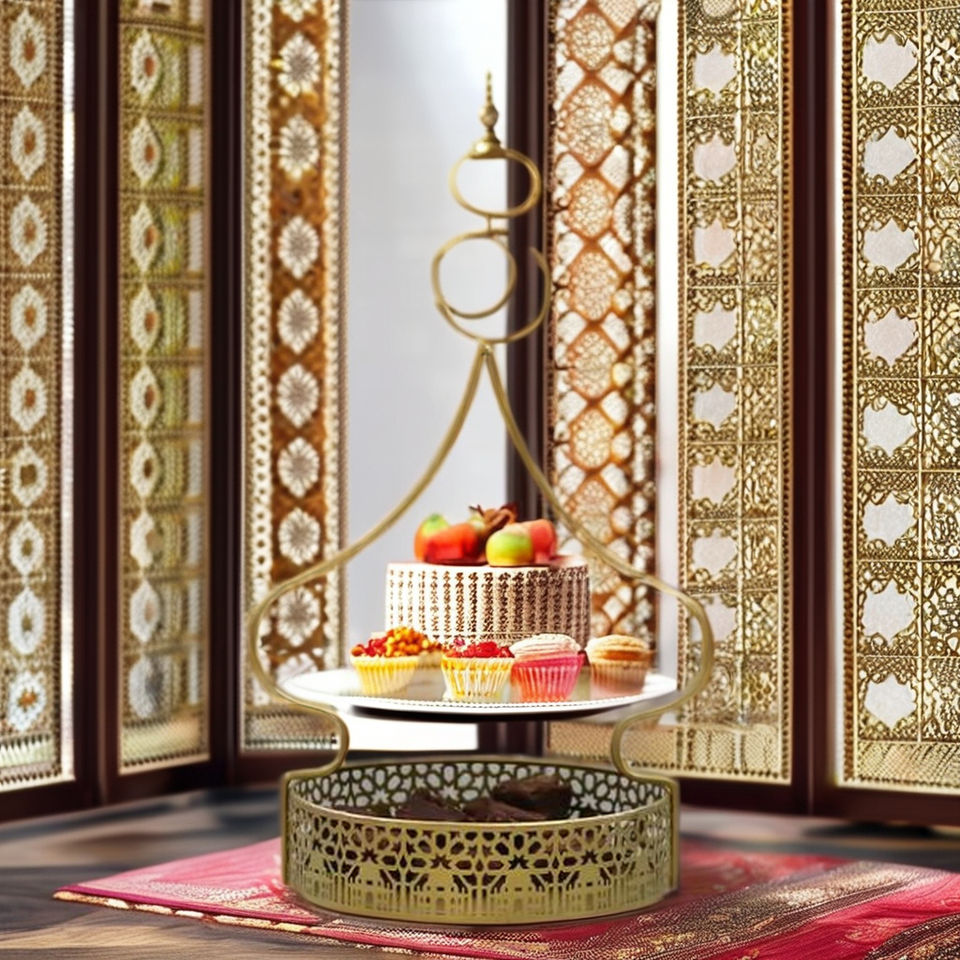 Arabic Gold Metal Stand with Minaret Silhouette Cake Tray for Ramadan for Cookies and Cakes