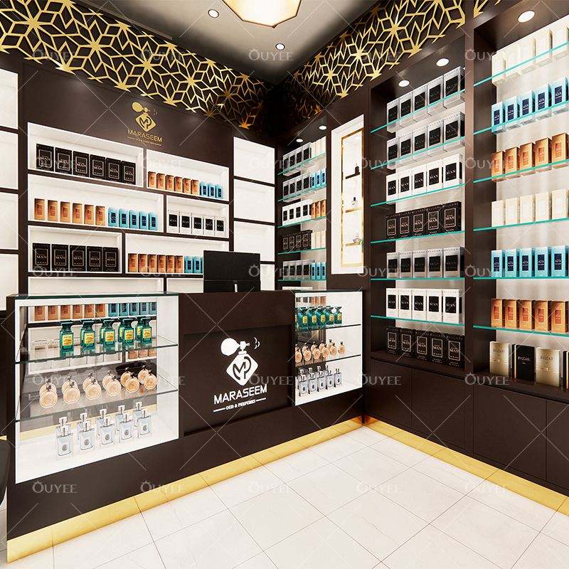 Arabic Luxury Perfume Shop Modern Design Acrylic Perfume Display Shelves Arabesque Wooden Wall Perfume Glass Display Showcase