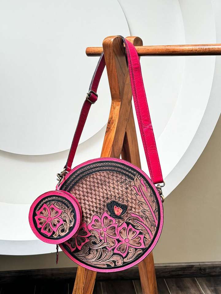 Arrival Pink Hand Tooled Leather Canteen Round Crossbody Purse Stylish Floral Tooled Leather Pink Coin Purse Combo for Women's