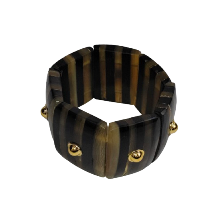 Art-Deco Style Striped Resin Cuff Bracelet in Black and Cream with Gold Ball Rivet Embellishments High-Fashion Chunky Jewelry