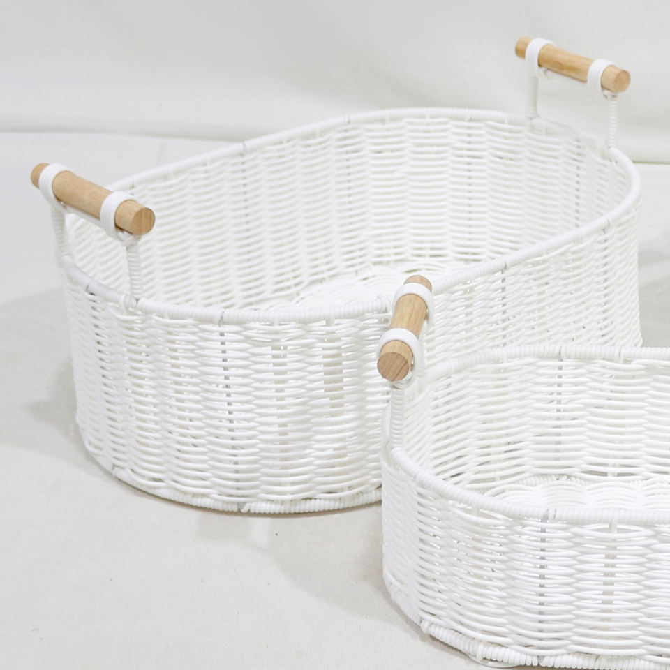 Artex Dong Thap Plastic Multifunction White Oval Storage Baskets Set with Wooden Handles 3 Pcs for Home Organization