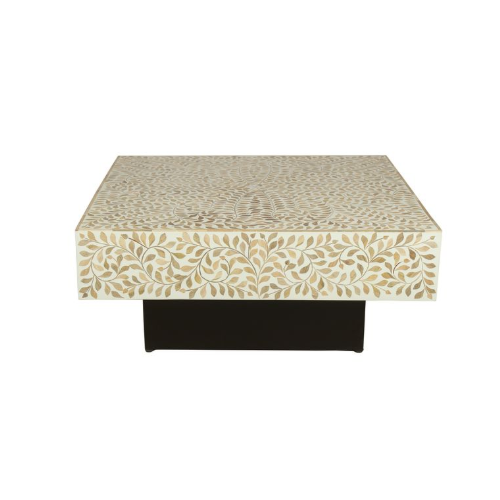 Artisan Accent Square Wood Inlay White Wooden Coffee Table Featuring Intricate Handcrafted Design and Black Metal Base