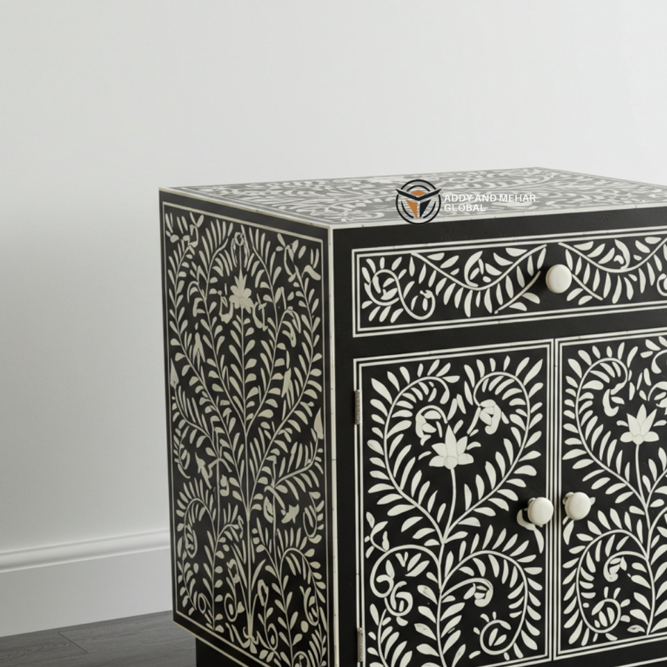 Artisan Eco-Friendly Modern Black Bone Inlay Nightstand Intricate Floral Pattern Two Drawer Bedroom Side Table