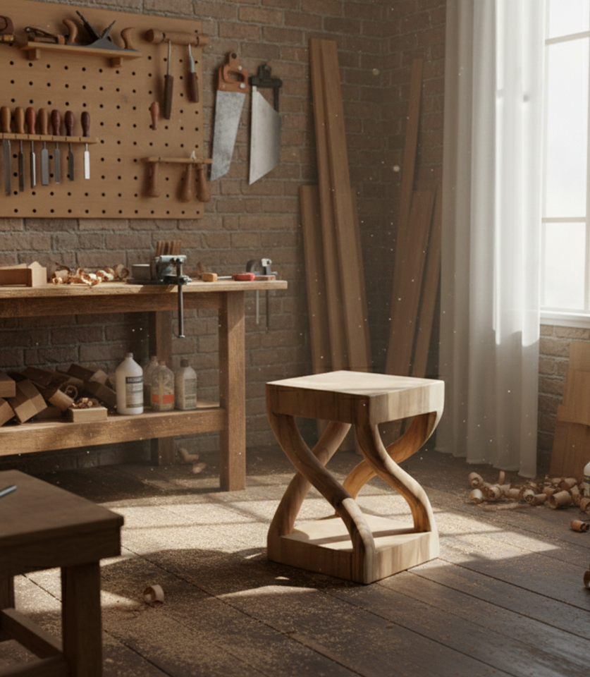 Artisan Made Suar Wood Stool Industrial Modern Design Eco-Friendly Sturdy Construction Warm Tones Elevates Bedroom Interior