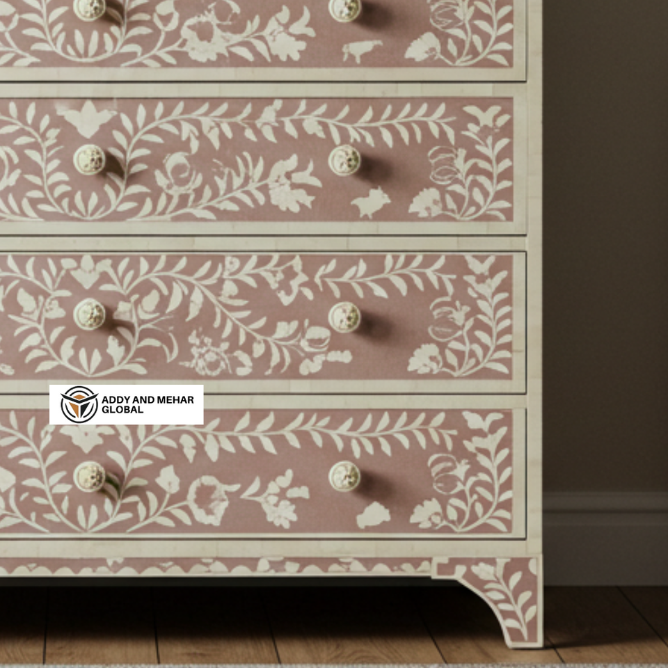 Artisan Modern Handmade Solid Mango Wood & Bone Inlay 6-Drawer Dresser with Floral Pattern for Bedroom and Living Room Storage