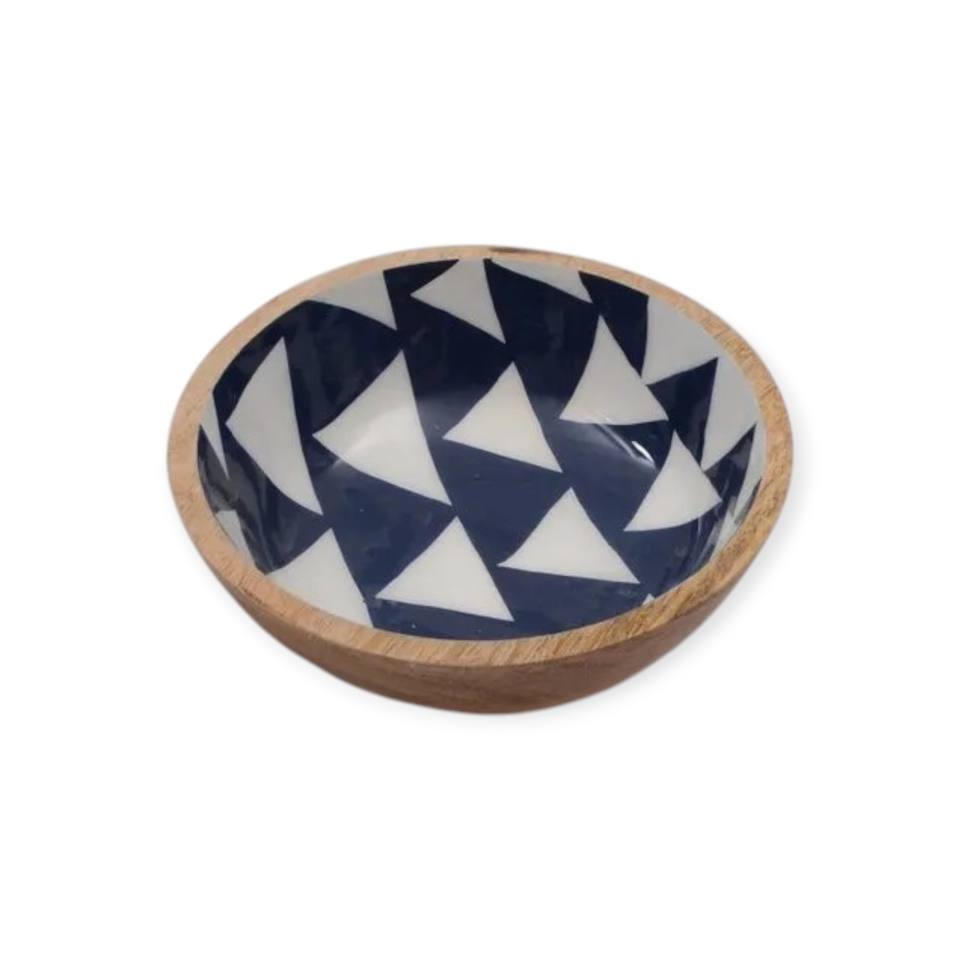 Artisan Wooden Bowl with Blue Chevron Enamel Pattern for Contemporary Dining and Decorative Table Display Zigzag