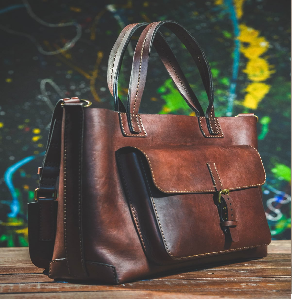 Artisan-crafted brown leather tote bag with a front flap pocket, reinforced stitching, and a detachable strap, at wholesale