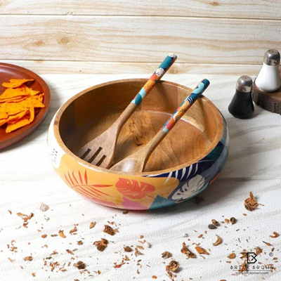 Artisan-crafted large wooden serving bowl featuring an abstract tropical leaf design, at wholesale prices.