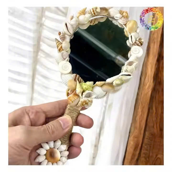 Artisan handheld shell mirror perfect for coastal inspired home decor boutique hotels villas and modern interior styling