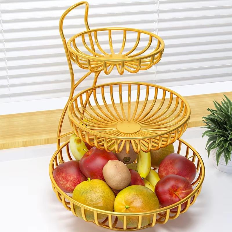 Artisan inspired design large 3 layered round metal fruit basket for elegant table centerpiece and everyday home fruit storage