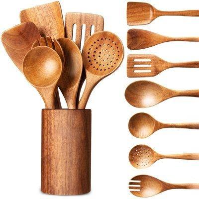 ArtisanVibe Natural Teak Wooden 10-Piece Kitchen Utensil Set with Spatula Spoon-Eco-Friendly Easy to Clean & Dishwasher Safe