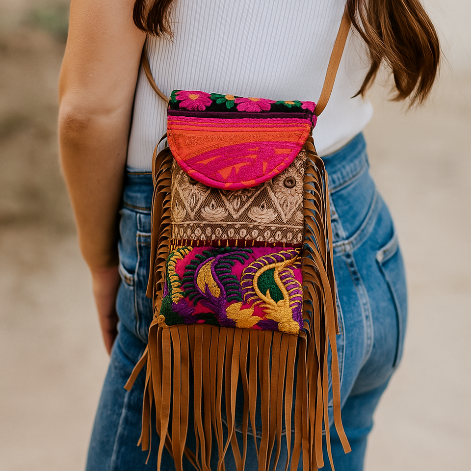 Artisanal Boho Crossbody Bag with Hand-Embroidered Design & Fringe