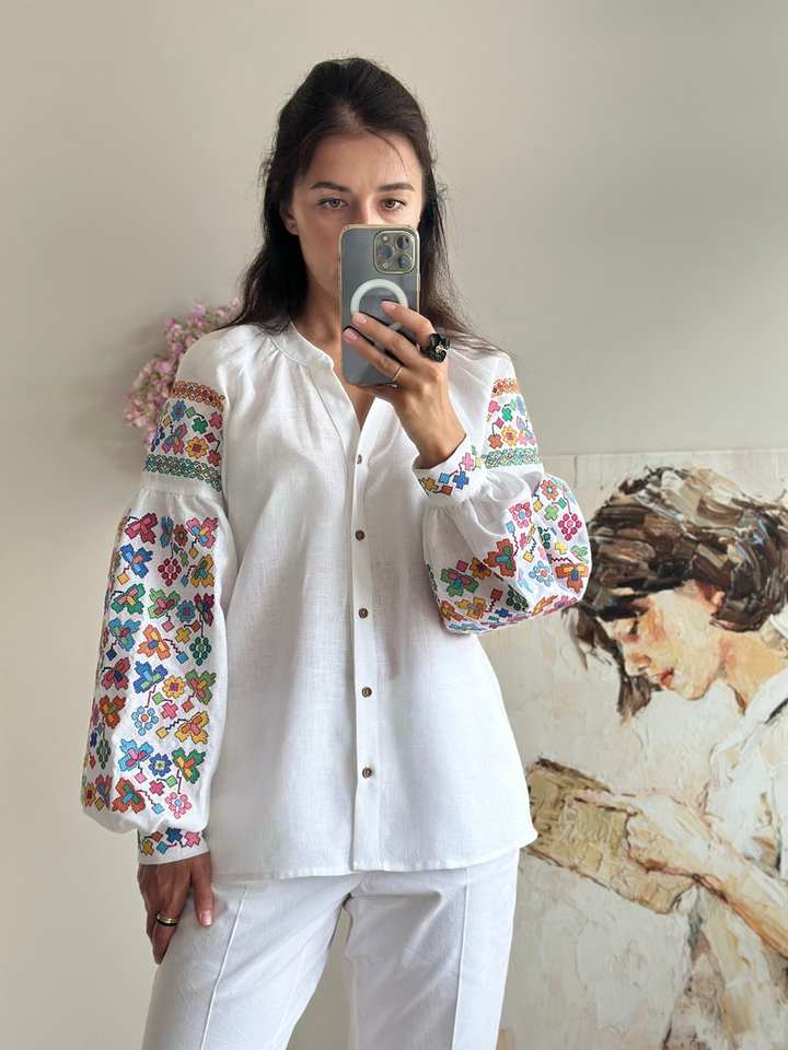 Artistic Bohemian Handcrafted Blouse Vyshyvanka Embroidered in Pure Linen Floral Pattern Top Gorgeous Detail Natural Waistline