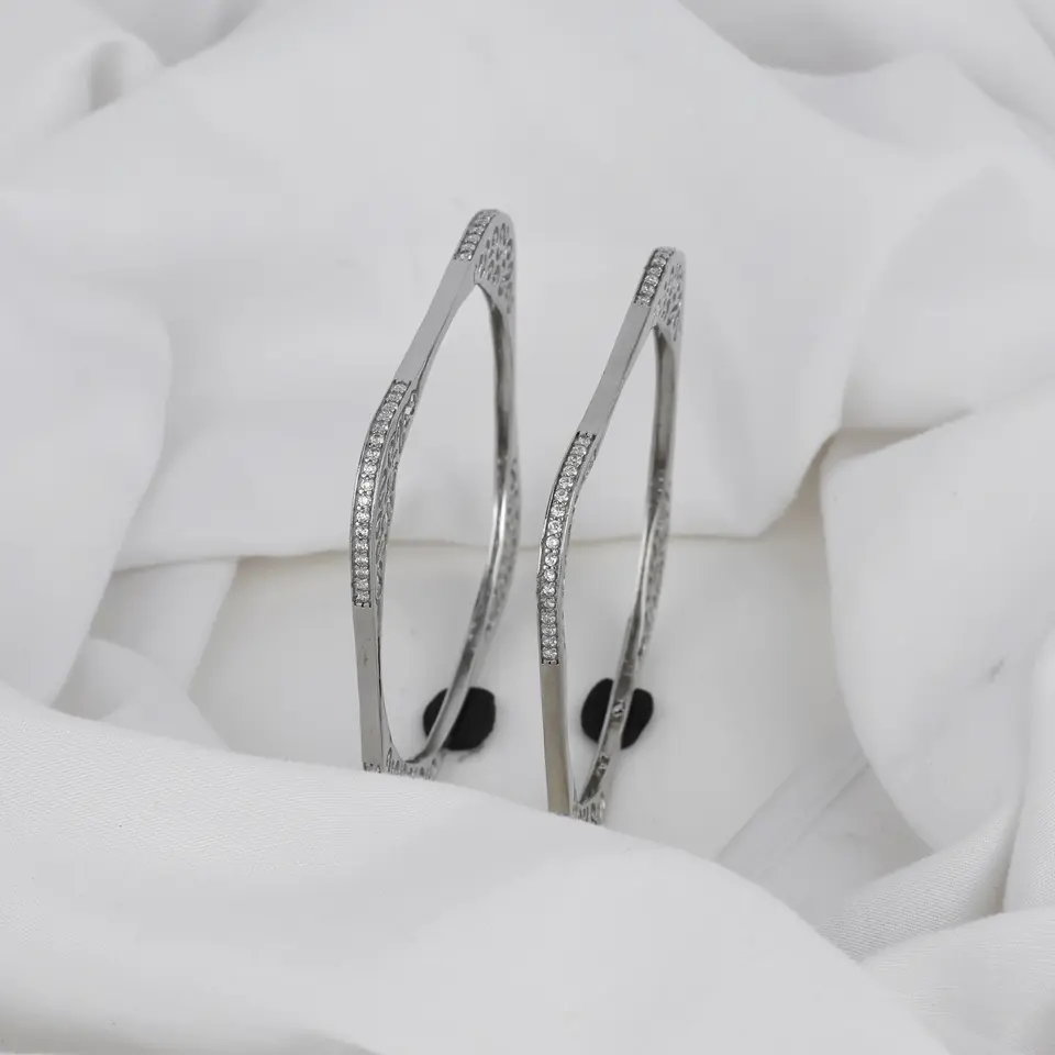 Artistic Sterling Silver Bangles Bracelets/Ring Set Classic Style with Flowing Edges and Dazzling Natural Crystal Made in India