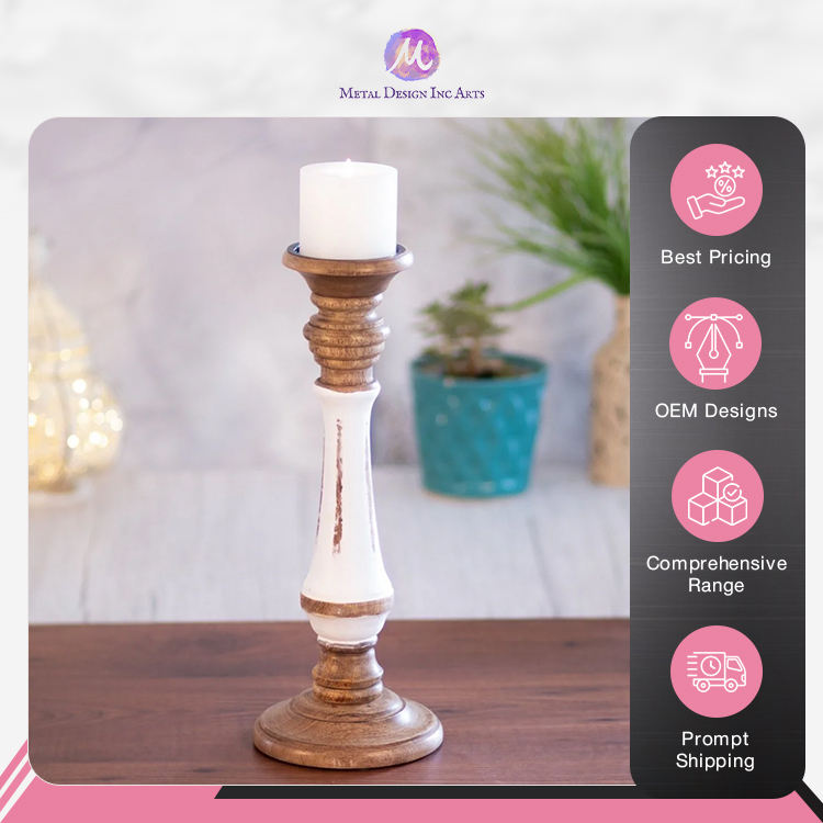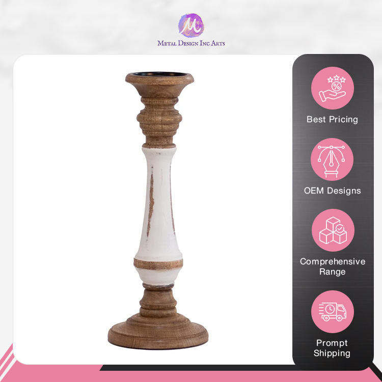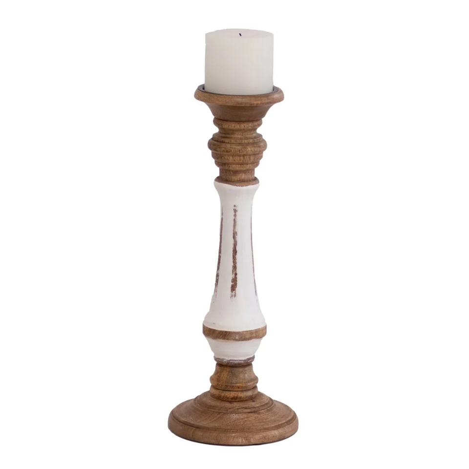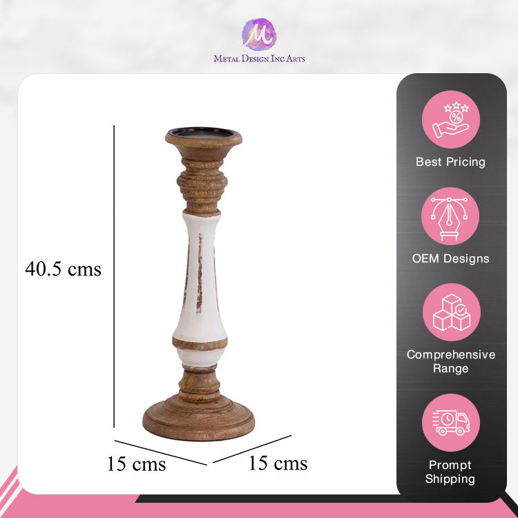 Artistic Vintage Brown & White Mango Wood Candle Holder - Elegant Handcrafted Pillar Design for Home Decor from Indian Seller