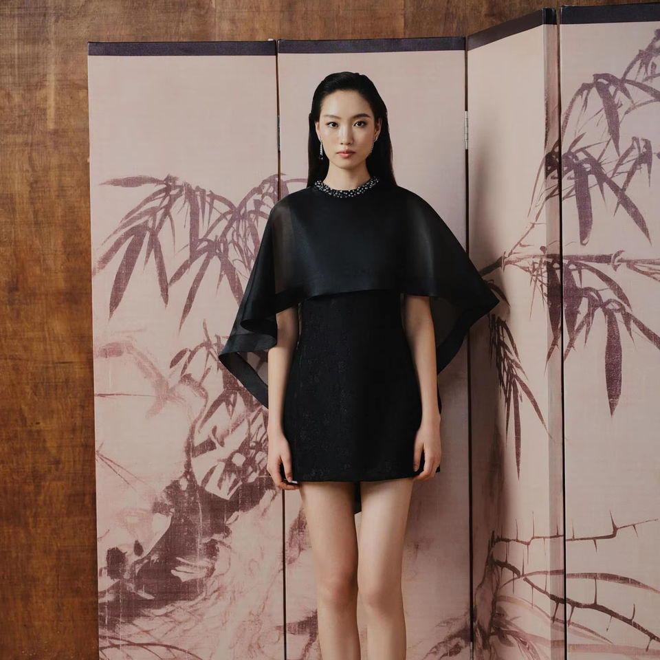 Asian spirit MISTY GRACE dress light organza cape overlay elegant modern classy cocktail dress OEM Vietnam