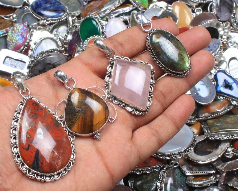 Assorted Hippie Crystal Pendants Necklace Handmade Sterling Silver Overlay Jewelry for Women Gift