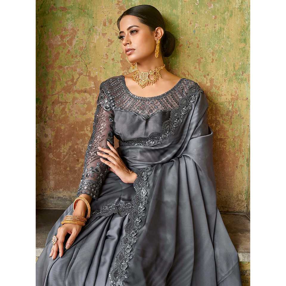 Astonishing Grey Embroidered Satin Party Wear Women's Set Including Saree with Blouse