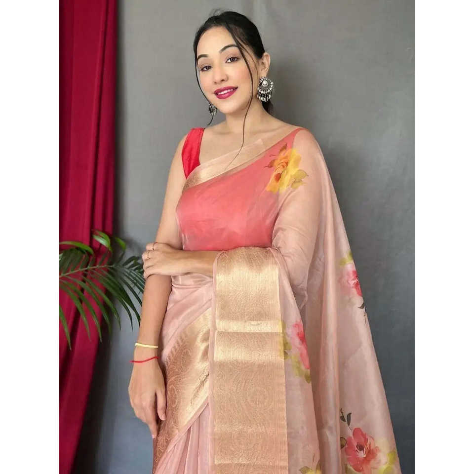 Astonishing Peach Pichwai Print Organza Performance Wear Saree with Blouse for Events