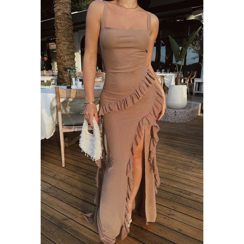 Astrid Mink Long Evening Dress Chic Ball Gown with Scoop Collar Empire Waistline Floor-Length with Slit for Party Occasions