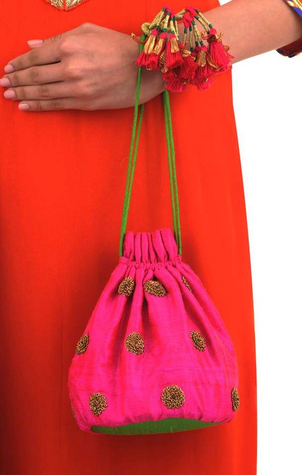 Atiya Libas Beautiful Potli Bag on Raw-Silk Fabric Hand Zardozi Embroidery Bucket Shape Dori Closure for Parties Wedding 2025