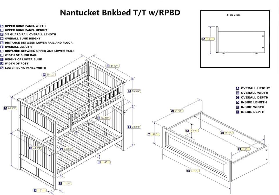 Atlantic Furniture Nantucket Twin/Twin Solid Wood Bunk Bed with 2 Walnut Raised Panel Drawers Traditional Design
