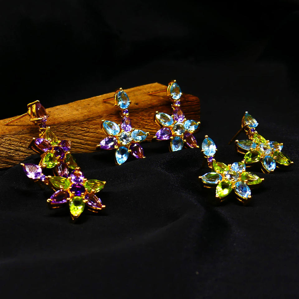 Attractive Gold Plating Sterling Silver 925 Drop Earrings with Amethyst Blue Topaz Peridot Gemstones for Wedding Ladies' Wear