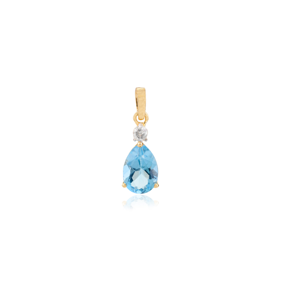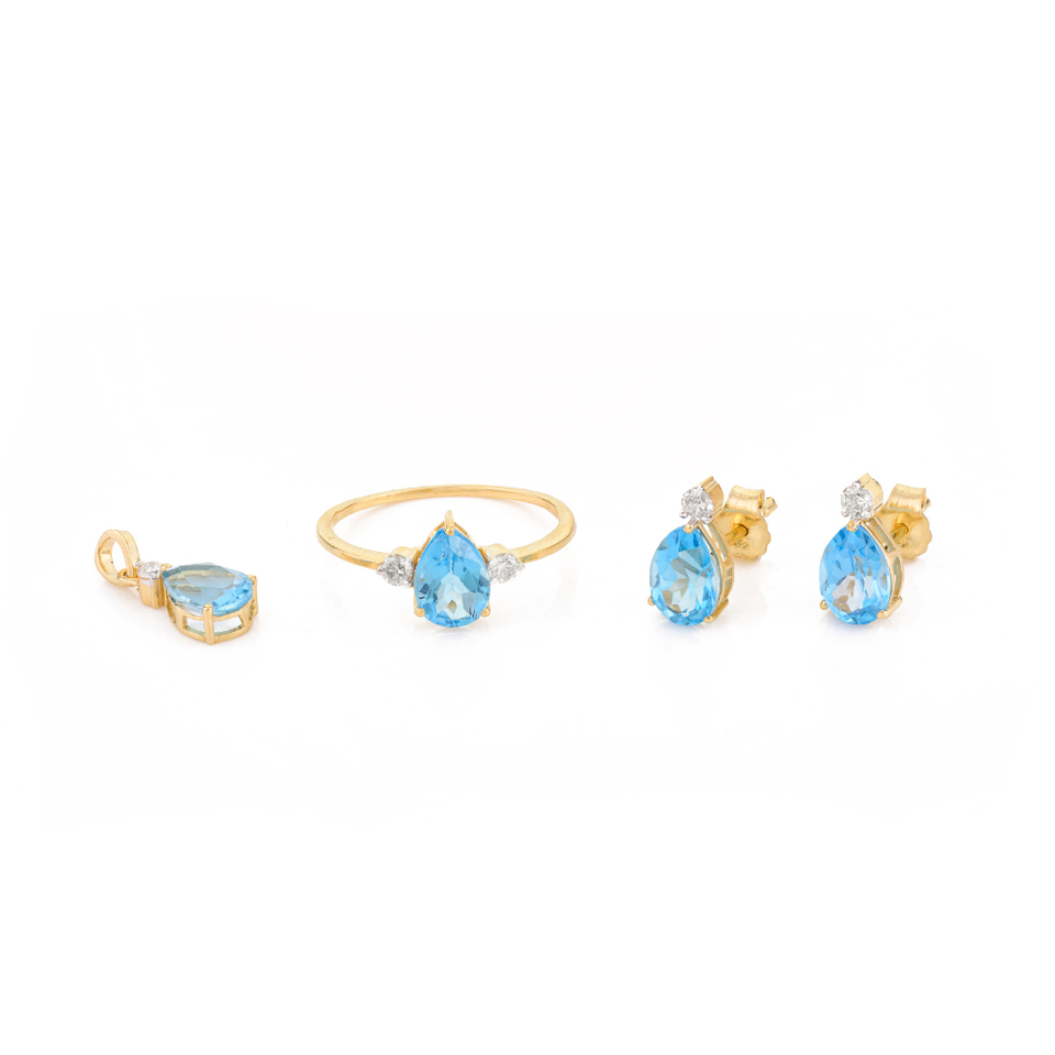 Attractive Most Beautiful Simple 18K Yellow Gold Blue Topaz & Diamond Ring Earrings & Pendant Women Fine Jewelry Set