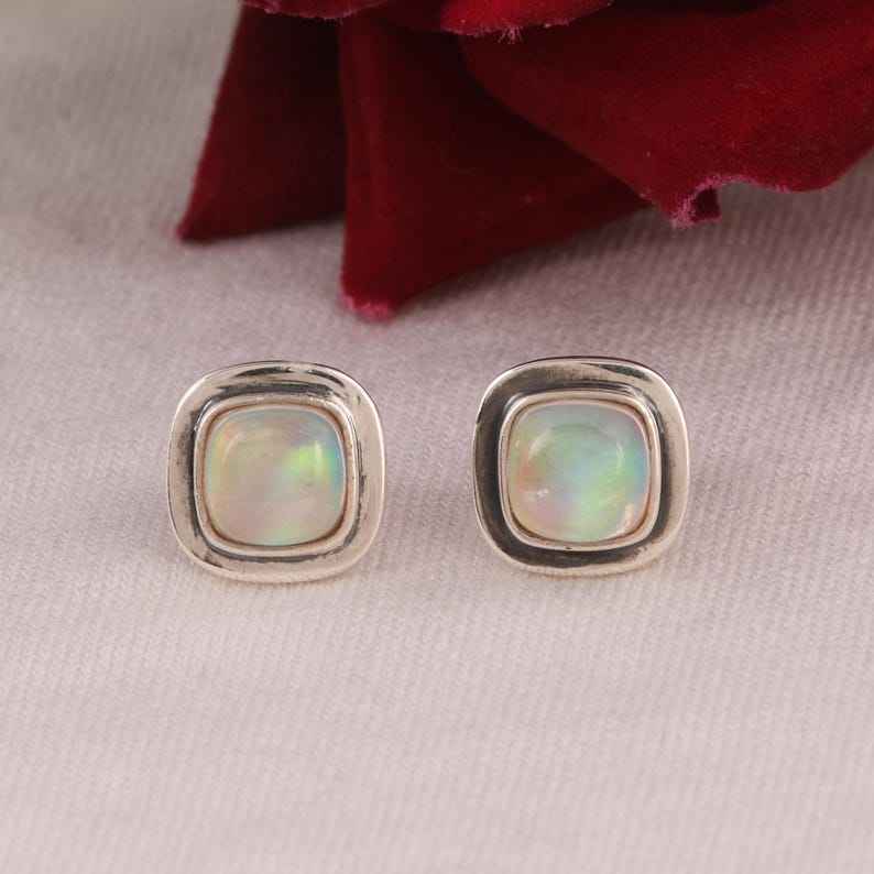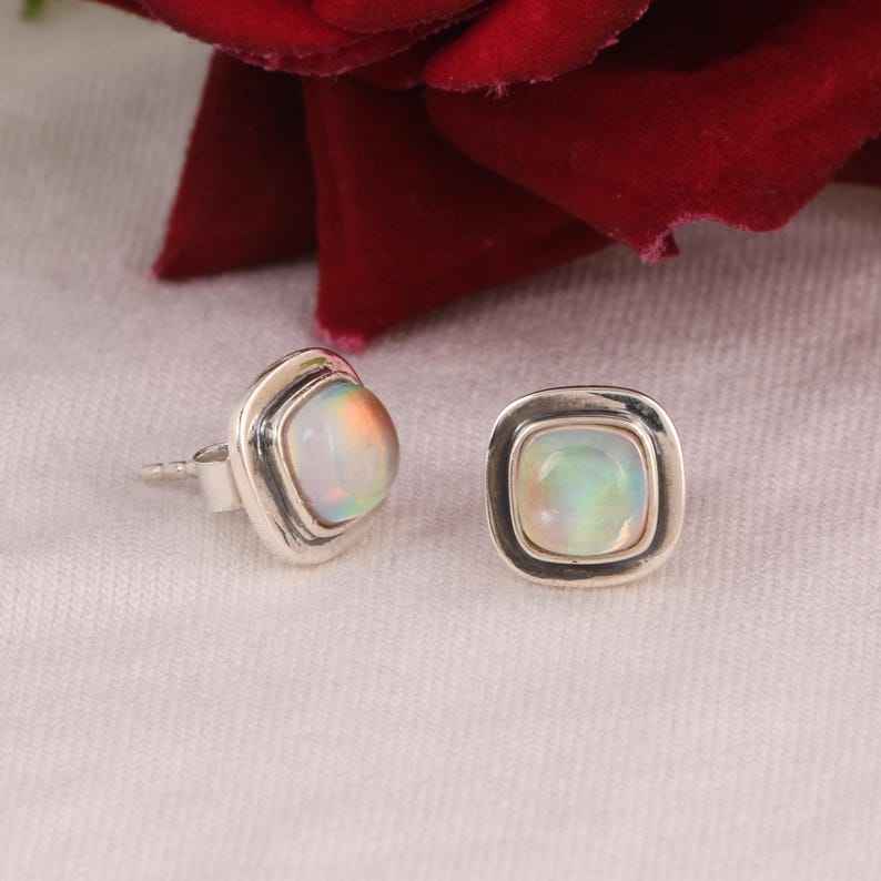 Aurora Opal Sterling Silver Stud Earrings Square Artisan Jewelry