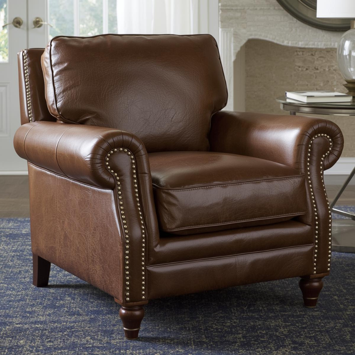 Authentic Genuine Cowhide Leather Arm Chair Real Leather Upholstered Accent Sofa Classic Rolled Arms Living Room Seating