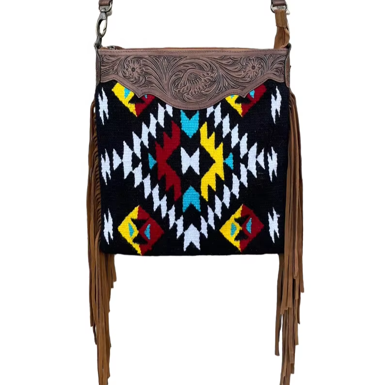 Authentic Single Vintage Cowhide Leather Crossbody Bag for Women Preppy New Aztec Design Tassel Handmade Woolen Saddle Blanket