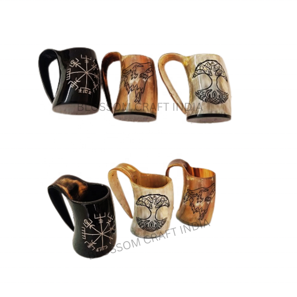 Authentic Viking Buffalo Horn Tumbler Hand Engraved Ox Horn Cup with Christmas Tree Design Polished Finish for Home Decor