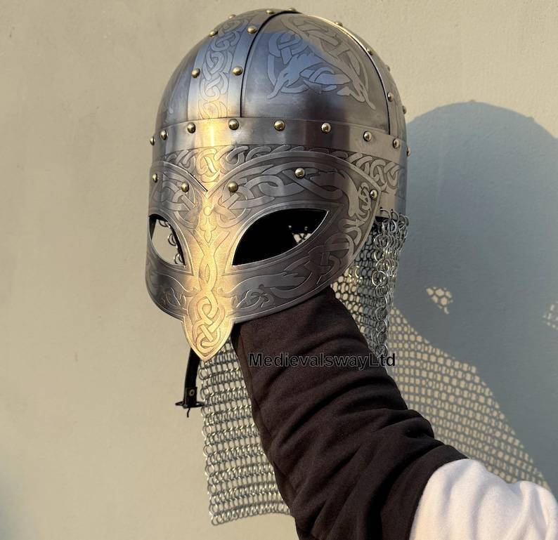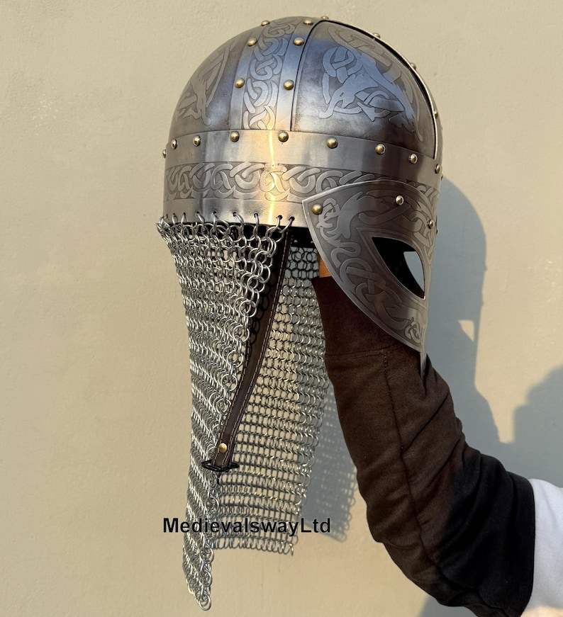 Authentic Viking Helmet with Chainmail Stand Etched Norse Warrior Battle Gear for Tabletop Display Steel Material for Graduation