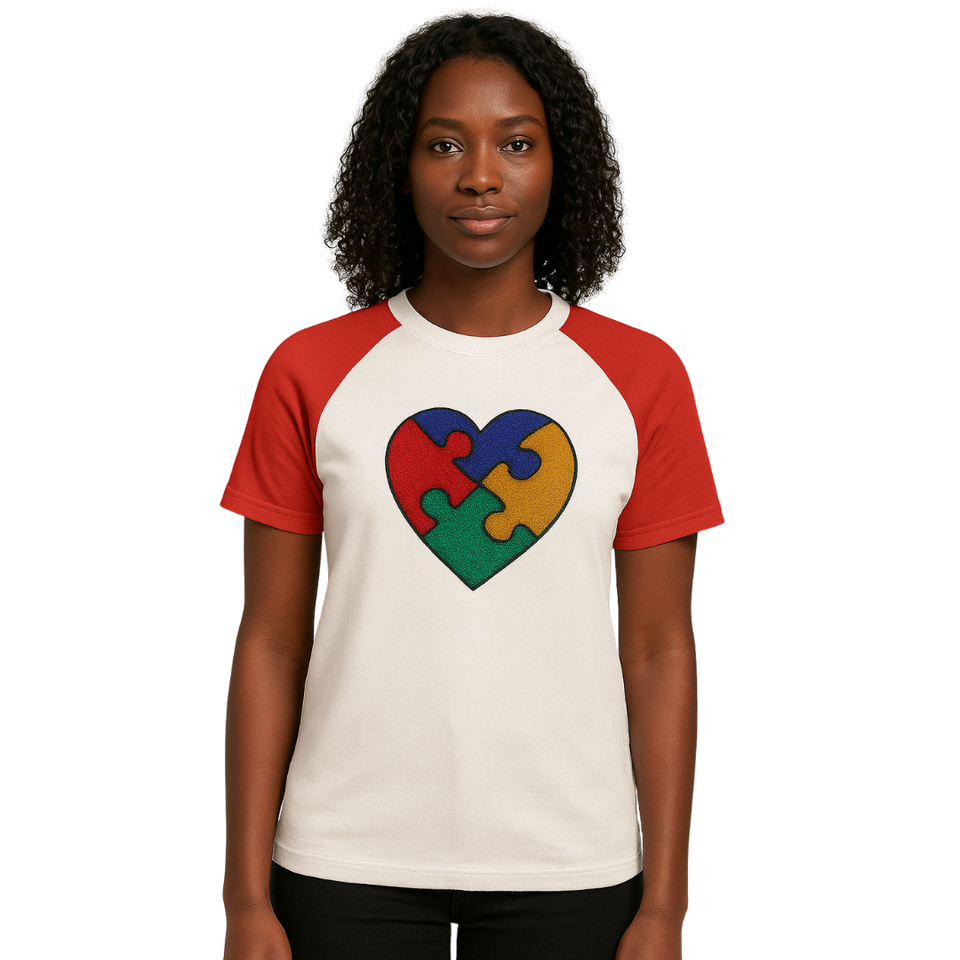 Autism Awareness Heart Puzzle Chenille Embroidery White Raglan Sleeves T Shirt Unisex 100 Cotton Jersey Support Clothing