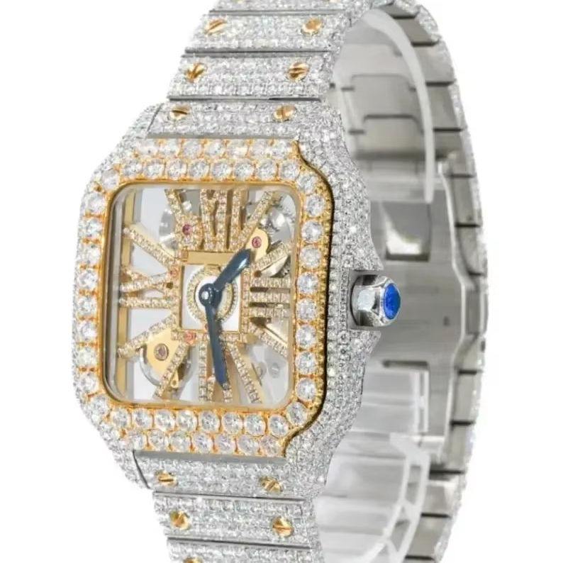 Automatic Skelton Vison Type Dial Gold Tone With Stainless Steel Watches and Silver Tone Square Dial moissanite Diamond