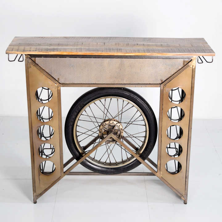 Automobile Design Industrial Style Solid Mango Wood and Metal Iron Bottle Holder Bar Counter for Home Bar Hotel Restaurant