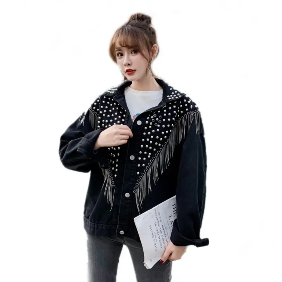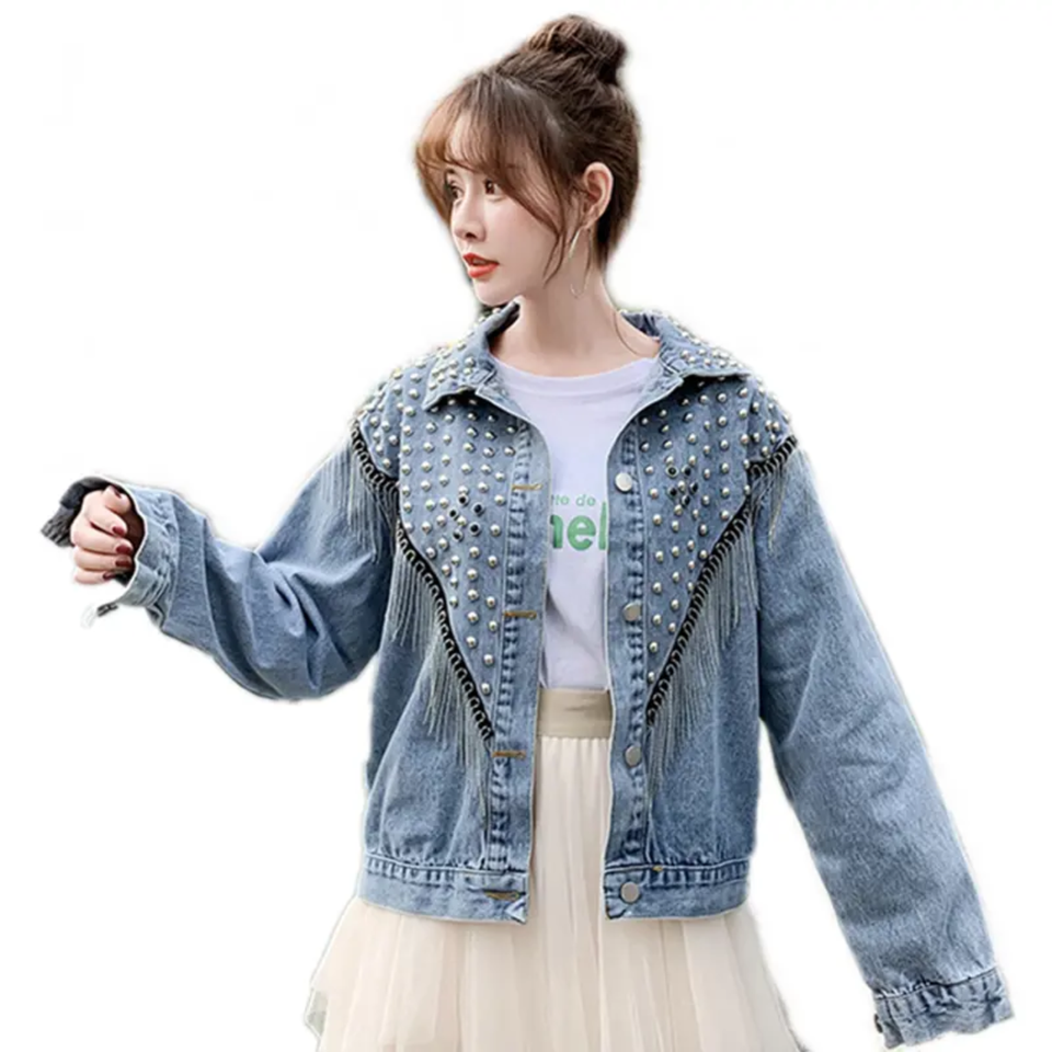 Autumn Blue Rivet Studded Fringe Western Denim Jackets for Women