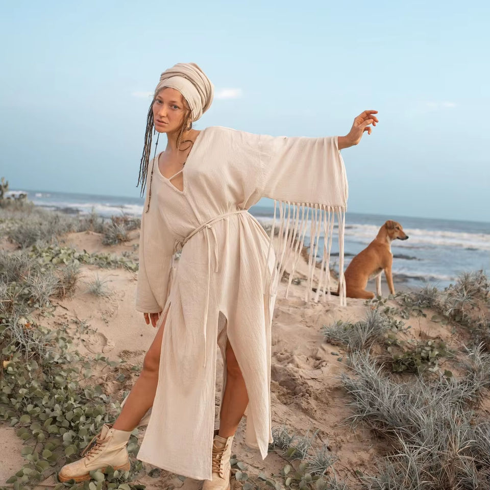 Autumn Boho Goddess Kaftan V-Neck Maxi Dress with Long Sleeves and Open Back Solid Pattern Fringe Dress